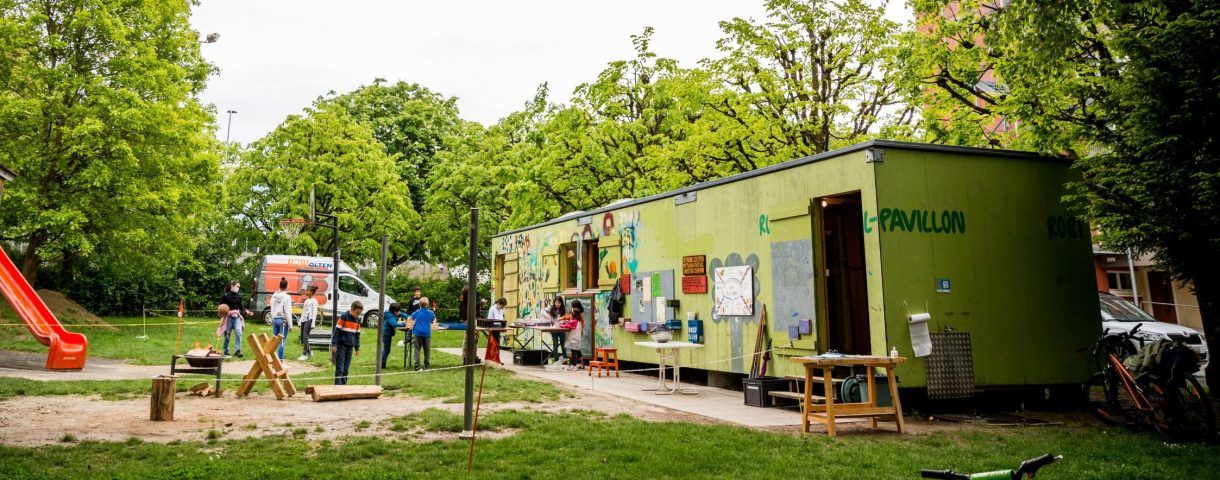 Spielpavillon mit diversem Spielmaterial und Kinder-Werkstatt im Vögeligarten.